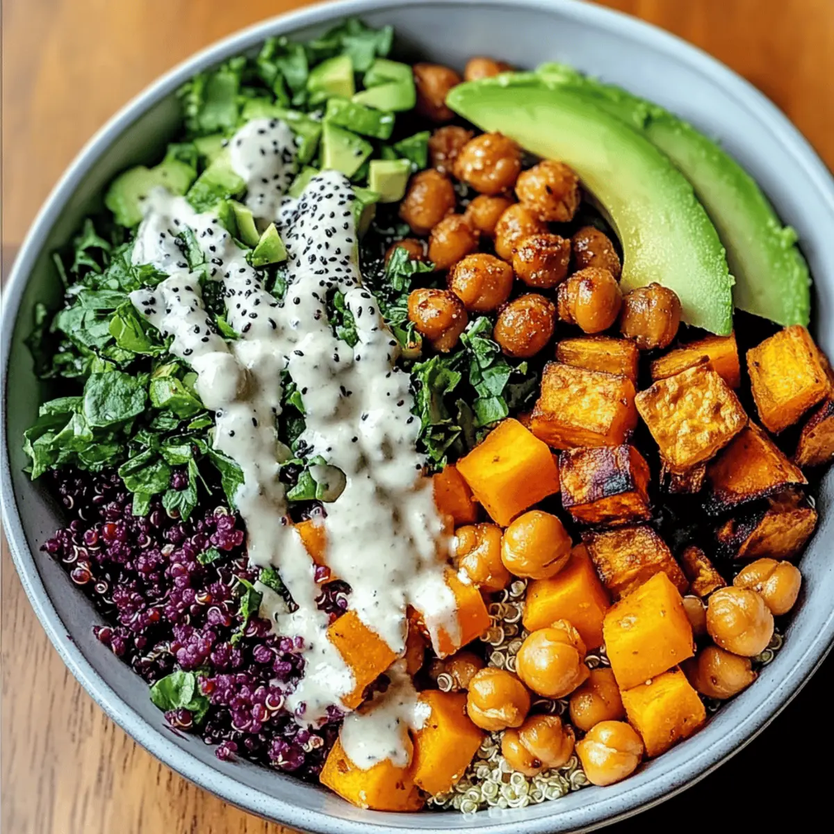 Jump to Recipe Print RecipeEn fouillant dans mon réfrigérateur, j’ai remarqué un mélange chatoyant de légumes frais qui inspiraient une idée: un Bol Bouddha Végétalien gourmand et personnalisé. Ce plat coloré est parfait pour ceux d’entre nous qui recherchent une alimentation saine et rapide, tout en réclamant une explosion de saveurs. Avec sa base de quinoa tendre, ses pois chiches croustillants, et une pléthore de légumes de saison, chaque bouchée vous éveille les sens. Et parlons de cette incroyable sauce tahini crémeuse qui rehausse l’ensemble, apportant une touche irrésistible à ce plat nourrissant. Que vous soyez pressé par le temps pendant une semaine chargée ou que vous souhaitiez épater vos invités, cette recette est un véritable bijou. Quels légumes aromatiques choisirez-vous pour créer votre propre chef-d’œuvre? Pourquoi essayer ce Bol Bouddha ? Facilité d’exécution : Vous n’avez besoin que de quelques ingrédients simples pour réaliser ce Bol Bouddha Végétalien, parfait pour les débutants comme pour les chefs expérimentés. Personnalisation à l’infini : Variez les légumes et les protéines selon vos envies, rendant chaque plat unique et adapté à votre goût. Saveurs éclatantes : L’association de quinoa, de pois chiches rôtis et de légumes frais offre un mélange de textures et de saveurs irrésistibles. Prêt en un rien de temps : Cette recette rapide et saine se prépare rapidement, idéale pour les soirées où le temps presse. Un plat équilibré : Avec ses nutriments riches et ses calories contrôlées, il est parfait pour un régime sain tout en étant satisfaisant. N’oubliez pas d’ajouter un peu de sauce tahini pour un goût encore plus incroyable ! Ingrédients du Bol Bouddha Végétalien • Le Bol Bouddha Végétalien est un plat simple à préparer, qui nécessite des ingrédients frais et savoureux. Pour la Base Quinoa – une excellente source de protéines, pensez à le rincer avant la cuisson pour éliminer l’amertume. Pour les Pois Chiches Pois chiches – pour un croquant irrésistible, utilisez des pois chiches en conserve; pensez à les égoutter et les rincer avant de les assaisonner. Pour les Légumes de Saison Légumes frais – choisissez selon la disponibilité, comme des patates douces, des poivrons, ou du brocoli; rôtissez-les ou faites-les cuire à la vapeur pour des résultats optimaux. Pour l’Avocat Avocat – ajoute une texture crémeuse; tranchez-le juste avant de servir pour une fraîcheur maximale. Pour la Sauce Sauce tahini – mélangez le tahini avec du jus de citron, de l’ail, et des épices pour sublimer les saveurs de votre Bol Bouddha Végétalien. Step-by-Step Instructions for Bol Bouddha Végétalien Simple et Gourmand Step 1: Cuire le quinoa Rincez 1 tasse de quinoa sous l’eau froide pour éliminer son amertume. Dans une casserole, combinez le quinoa avec 2 tasses d’eau ou de bouillon de légumes. Portez à ébullition, puis réduisez le feu et laissez mijoter, couvercle en place, pendant 15 minutes. Retirez du feu et laissez reposer 5 minutes à couvert pour que le quinoa devienne léger et moelleux. Step 2: Préparer les pois chiches Préchauffez le four à 220°C (425°F). Égouttez et rincez 1 boîte de pois chiches, puis séchez-les à l’aide d’un torchon. Dans un grand bol, mélangez les pois chiches avec de l’huile d’olive, du paprika fumé, de la poudre d’ail, du sel et du poivre. Étalez-les sur une plaque de cuisson et enfournez pendant 25 à 30 minutes, jusqu’à ce qu’ils soient dorés et croustillants, en les secouant à mi-cuisson. Step 3: Cuire les légumes Si vous choisissez de rôtir vos légumes, préchauffez le four à 200°C (400°F). Coupez vos légumes de saison (comme des patates douces, des poivrons ou du brocoli) et ajoutez-les dans un bol. Arrosez-les d’huile d’olive et saupoudrez de sel. Étalez sur une autre plaque et rôtissez pendant 20 à 25 minutes, jusqu’à ce qu’ils soient tendres et légèrement caramélisés. Vous pouvez également les faire cuire à la vapeur si vous préférez. Step 4: Assembler le bol Dans un grand bol, commencez par déposer une base de quinoa. Ajoutez ensuite une couche généreuse de pois chiches rôtis et de légumes de saison. Pour finir, tranchez un avocat et disposez-le sur le dessus. Avant de servir, nappez le tout avec de la sauce tahini crémeuse pour rehausser les saveurs de votre Bol Bouddha Végétalien. Préparation à l’avance pour le Bol Bouddha Végétalien Pour les cuisiniers pressés, le Bol Bouddha Végétalien se prête parfaitement à la préparation à l’avance, vous permettant de gagner du temps pendant la semaine. Vous pouvez cuisiner le quinoa jusqu’à 3 jours à l’avance; conservez-le dans un contenant hermétique au réfrigérateur pour qu’il reste moelleux. Les pois chiches rôtis peuvent également être préparés jusqu’à 3 jours et doivent être stockés séparément pour maintenir leur croustillant. Les légumes, coupés mais non cuits, peuvent être conservés jusqu’à 24 heures dans un sachet Zip à l’abri de l’air, ce qui préserve leur fraîcheur. Quand vient le moment de déguster, chauffez le quinoa et les légumes si désiré, puis assemblez rapidement votre Bol Bouddha Végétalien avec des touches de sauce tahini pour un repas sain et savoureux en un rien de temps ! Conseils d’Expert pour le Bol Bouddha Végétalien Crispiness des pois chiches : Pour une texture vraiment croustillante, assurez-vous que vos pois chiches soient complètement secs avant de les rôtir. Préparation à l’avance : Conservez les composants séparément, comme le quinoa, les pois chiches et les légumes, pour un repas prêt en un rien de temps tout en préservant la fraîcheur. Uniformité de coupe : Assurez-vous que vos légumes sont coupés en morceaux de taille uniforme pour une cuisson homogène. Touche personnalisée : N’hésitez pas à rempla