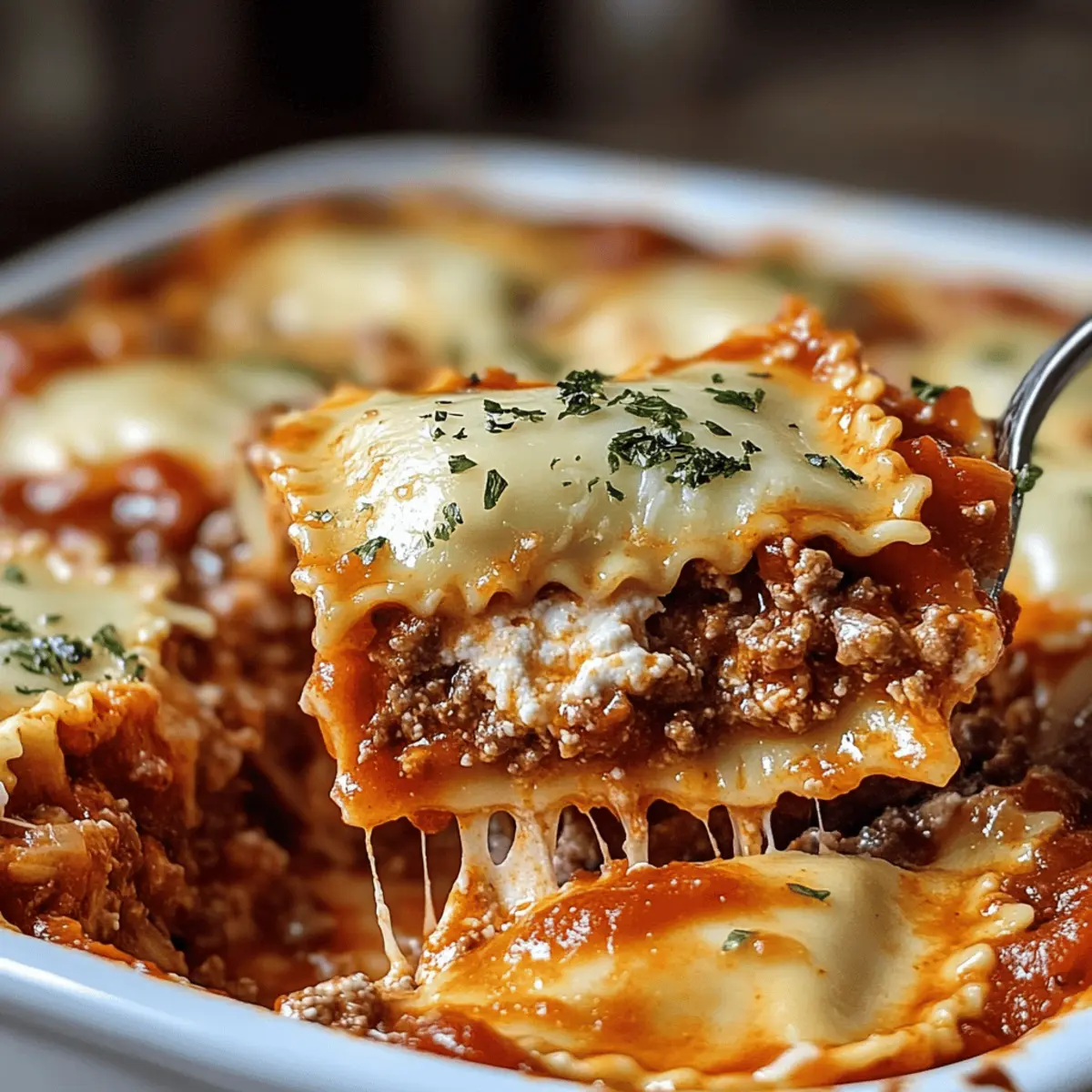 Jump to Recipe Print RecipeEn entrant dans ma cuisine, l’odeur réconfortante d’un plat qui mijote me rappelle pourquoi j’aime tant cuisiner. Aujourd’hui, je partage avec vous ma recette de Casserole de Ravioles à un Million de Dollars, un véritable festin qui mêle simplicité et indulgence. Ce plat est parfait pour les repas en famille ou les potlucks, avec sa riche sauce à la viande et ses ravioles au fromage qui se marient merveilleusement. Non seulement cette casserole est un vrai régal pour les papilles, mais elle est également rapide à préparer, vous permettant de passer plus de temps à profiter de la compagnie de vos proches. Je parie que vous serez curieux de découvrir les secrets de cette recette qui ne manquera pas d’impressionner vos invités. Alors, prêts pour l’aventure culinaire ? Pourquoi cette casserole est-elle si appréciée ? Simplicité : Cette casserole est incroyablement facile à préparer, même pour les novices en cuisine. Avec des ingrédients simples, tout le monde peut l’apprécier ! Saveurs riches : La combinaison d’une sauce à la viande bien assaisonnée et de ravioles au fromage se traduira par un goût inoubliable à chaque bouchée. Idéale pour les rassemblements : Que ce soit pour une soirée entre amis ou un repas de famille, cette recette est parfaite pour impressionner et nourrir une foule, tout en vous laissant du temps pour socialiser. Polyvalente : Vous pouvez ajuster la recette à votre goût, en remplaçant le bœuf par du poulet ou en ajoutant des légumes pour une touche plus saine. Reste savoureux : Les restes se réchauffent à merveille, vous garantissant des délices même les jours suivants. Votre famille va l’adorer ! Ingrédients pour la Casserole de Ravioles à un Million de Dollars • Découvrez les ingrédients clés qui rendent ce plat vraiment spécial. Pour la Casserole Ravioles au fromage – L’élément principal qui apporte une texture délicieuse et satisfaisante. Bœuf haché – Ajoute richesse et profondeur; peut être remplacé par du poulet haché ou une alternative végétale pour une option plus légère. Ail – Rehausse l’arôme du plat; optez pour de l’ail frais, mais l’ail en poudre fait l’affaire si besoin. Fromage ricotta – Contrairement aux autres fromages, il apporte une crémeux riche; remplacez-le par du fromage cottage pour une option plus légère. Fromage mozzarella – Offre une texture fondante et filante; choisissez de la mozzarella à faible humidité pour une meilleure fusion. Assaisonnement italien – Équilibre les saveurs avec des notes herbacées; les mélanges faits maison ou tout prêt fonctionnent très bien. Sauce tomate – Base de votre sauce à viande, ajoutant une belle acidité; peut être échangée avec de la marinara pour plus de saveur. Huile d’olive – Utilisée pour faire revenir la viande, elle enrichit le plat en goût. Pour une Option Plus Savoureuse Épinards frais ou légumes hachés – Ajoutent des nutriments et de la couleur; incorporez-les entre les couches pour une explosion de fraîcheur. Ces ingrédients réunis dans votre casserole de ravioles à un million de dollars créeront une expérience culinaire réconfortante et mémorable. Bon appétit ! Instructions pour la Casserole de Ravioles à un Million de Dollars Step 1: Préchauffage du four Préchauffez votre four à 350°F (175°C) pour préparer la cuisson de la Casserole de Ravioles à un Million de Dollars. Cette température permettra aux saveurs de se mélanger et au fromage de fondre à la perfection. Pendant que le four chauffe, vous pouvez rassembler tous vos ingrédients pour une préparation efficace. Step 2: Faire revenir la viande Dans une grande poêle, chauffez un peu d’huile d’olive à feu moyen. Ajoutez l’ail émincé et le bœuf haché, puis faites cuire jusqu’à ce qu’il soit bien doré, environ 5 à 7 minutes. Assurez-vous de briser la viande en morceaux pendant la cuisson pour une texture homogène, puis retirez du feu et laissez un peu refroidir. Step 3: Ajouter la sauce Ajoutez la sauce tomate et l’assaisonnement italien à votre mélange de viande dans la poêle. Remuez bien pour combiner tous les ingrédients, puis laissez mijoter à feu doux pendant environ 10 minutes. Cela permettra aux saveurs de se développer et de donner une belle consistance à votre sauce. Step 4: Préparer le mélange de fromages Dans un bol, combinez le fromage ricotta avec une pincée de sel et de poivre. Mélangez bien jusqu’à ce que le tout soit homogène et crémeux. Ce mélange de fromages apportera une texture riche et un goût savoureux à la Casserole de Ravioles à un Million de Dollars. Step 5: Monter la casserole Dans un plat de cuisson, commencez par étaler la moitié des ravioles au fromage au fond. Recouvrez-les avec la moitié de la sauce à la viande, puis déposez des cuillerées du mélange de ricotta et terminez avec la moitié de la mozzarella. Répétez les couches une seconde fois avec les ingrédients restants pour une présentation généreuse. Step 6: Cuisson de la casserole Couvrez le plat de cuisson avec du papier d’aluminium et enfournez pour environ 30 minutes. Ensuite, retirez le couvercle et laissez cuire encore 15 minutes, ou jusqu’à ce que le fromage soit bien doré et bouillonnant. Surveillez bien pour obtenir une croûte dorée parfaite. Step 7: Servir la casserole Une fois cuite, sortez la casserole du four et laissez-la reposer pendant environ 10 minutes avant de servir. Cela permettra aux couches de bien se stabiliser, rendant le service plus facile. La Casserole de Ravioles à un Million de Dollars est maintenant prête à être dégustée, ravissant vos invités avec son apparence appétissante et ses saveurs riches. Conseils d’Expert pour la Casserole de Ravioles à un Million de Dollars Assaisonnement essentiel : Avant de commencer les couches, goûtez votre sauce à la viande. Un bon assaisonnement est cl